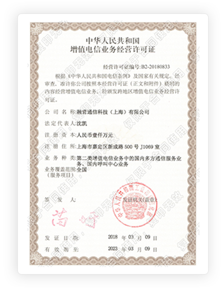 融营智能科技(上海)有限公司(以下简称:公司),是国内领先的企业智能云通信服务机构,拥有全国范围内授权许可的增值电信业务和多方通信业务的资质能力,