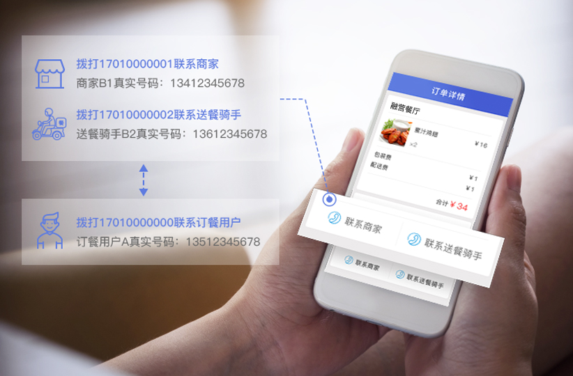 顾客与商家、顾客与送餐骑手都通过平台分配的隐私号码呼叫对方,保护各方号码不泄露